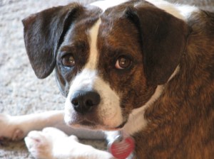 This is Bo, our Boggle (Boston Terrier/Beagle combo). She is usually camera-shy, but gave me this sweet look before running from the camera. Bo is pretty much scared of everything. If the big blue exercise ball is in the room, she won’t come through the door. When the vacuum cleaner starts up, she high-tails it to the farthest corner of the house. When the camera is pointed in her direction, she turns away and tiptoes out of the room. She won’t play fetch because she’s afraid of the tennis ball. It’s a sad way to live.