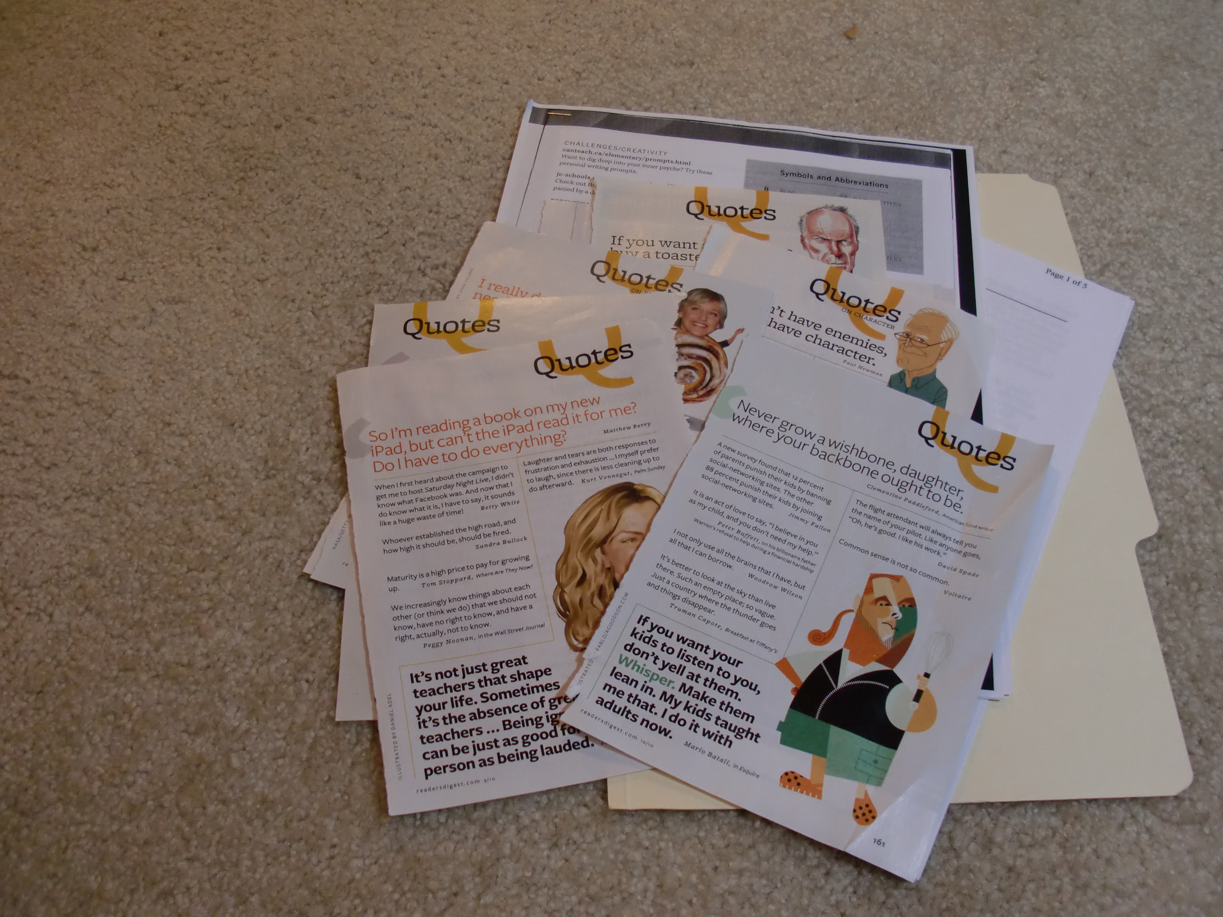 I have a writing file where stories I’ve started, writing prompts, and every “Quotable Quotes” page from Reader’s Digest’s last 10 years are tucked.