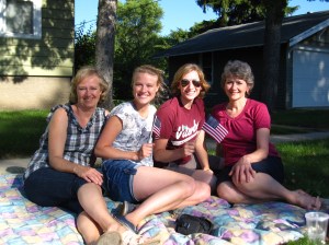 On the way home, we drove through the beautiful Green Lake Conference Center resort area.  Unfortunately, the prayer tower was locked so we couldn’t climb up to take in the panaramic view of the lake.  To their credit, the girls tried like the dickens to pick the lock with three bobbie pins, but to no avail.  Further down the road, a little town was kicking off its 4th of July parade, so we plopped down on a blanket and soaked up some small town patriotism.  We clapped for the middle school band with one lone trumpet player trying his best to carry 12 squeaky clarinets in “America the Beautiful”.  We picked up candy and gave it to the little boy next to us, except for the Tootsie Roll that Beth made a dive for.  We cheered for the Shriners on their little scooters and bought the girls a brat.