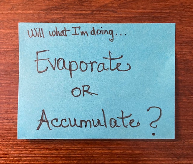 1. Wow! That shows significance in actions. I usually shy away from accumulation bc it is usually STUFF! But when you write as you did, evaporation is worse!!! So thankful you write your blog. So thankful I am able to read your blog. I usually save them in my email bc they are dear. Accumulating words I like to ponder. Thank you Dinah. Well done!