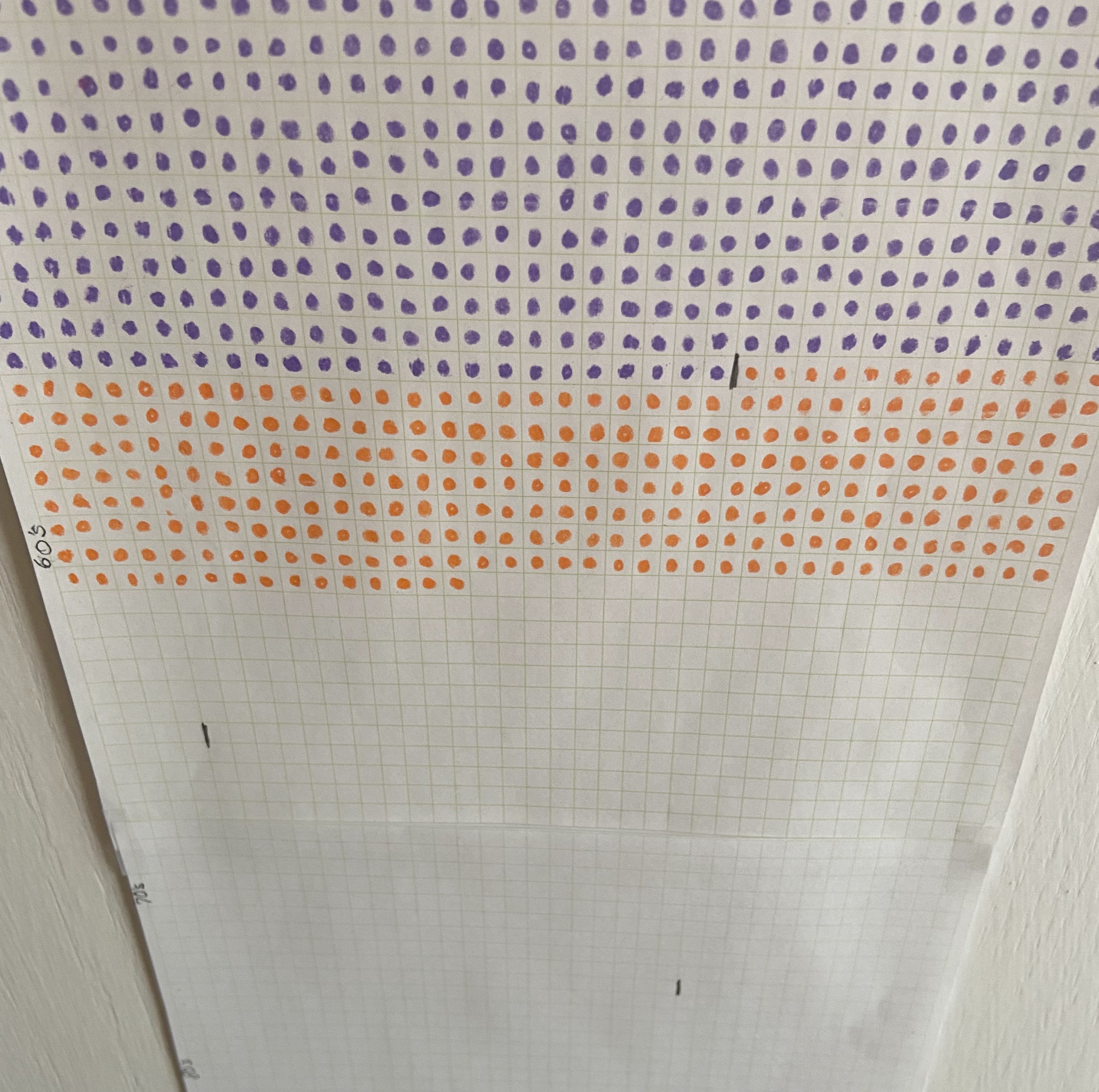 See those dark pink dots? Those are my 20s. Five hundred and twenty blue dots cover my 30s. My 40s are shown by yellow dots and purple dots represent my 50s. I’m well into my orange-dot-decade.