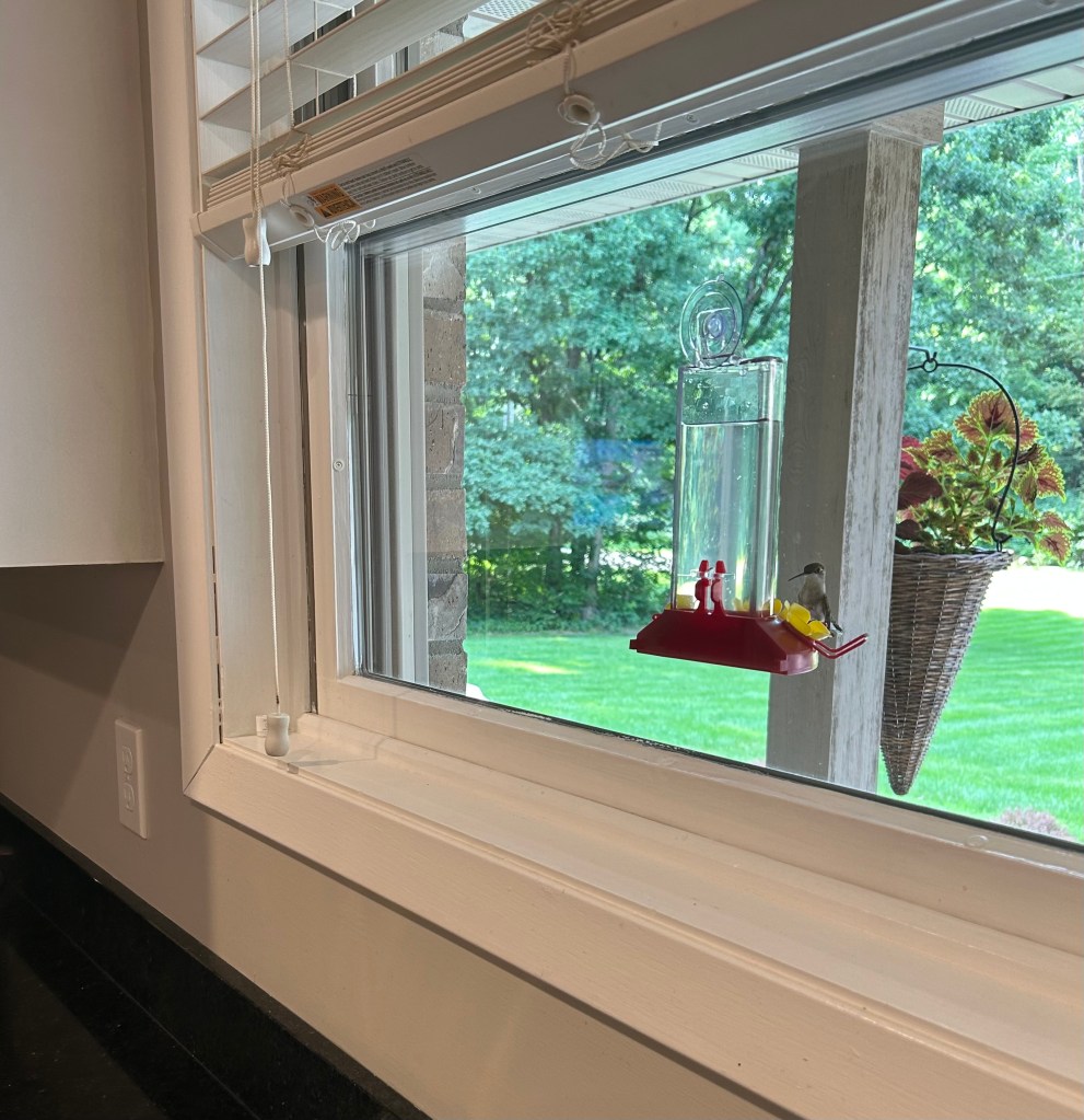 PB put a hummingbird feeder on the kitchen window. The little hummers buzz around like dive-bombers in the back yard, but I wanted a little action in the front window.