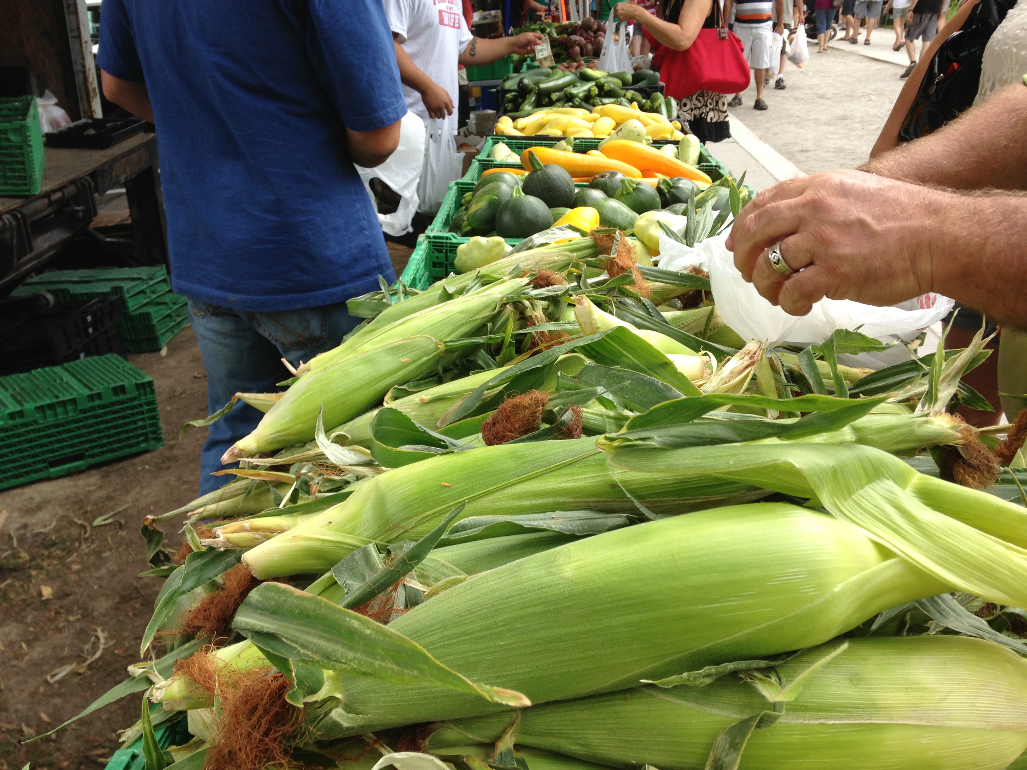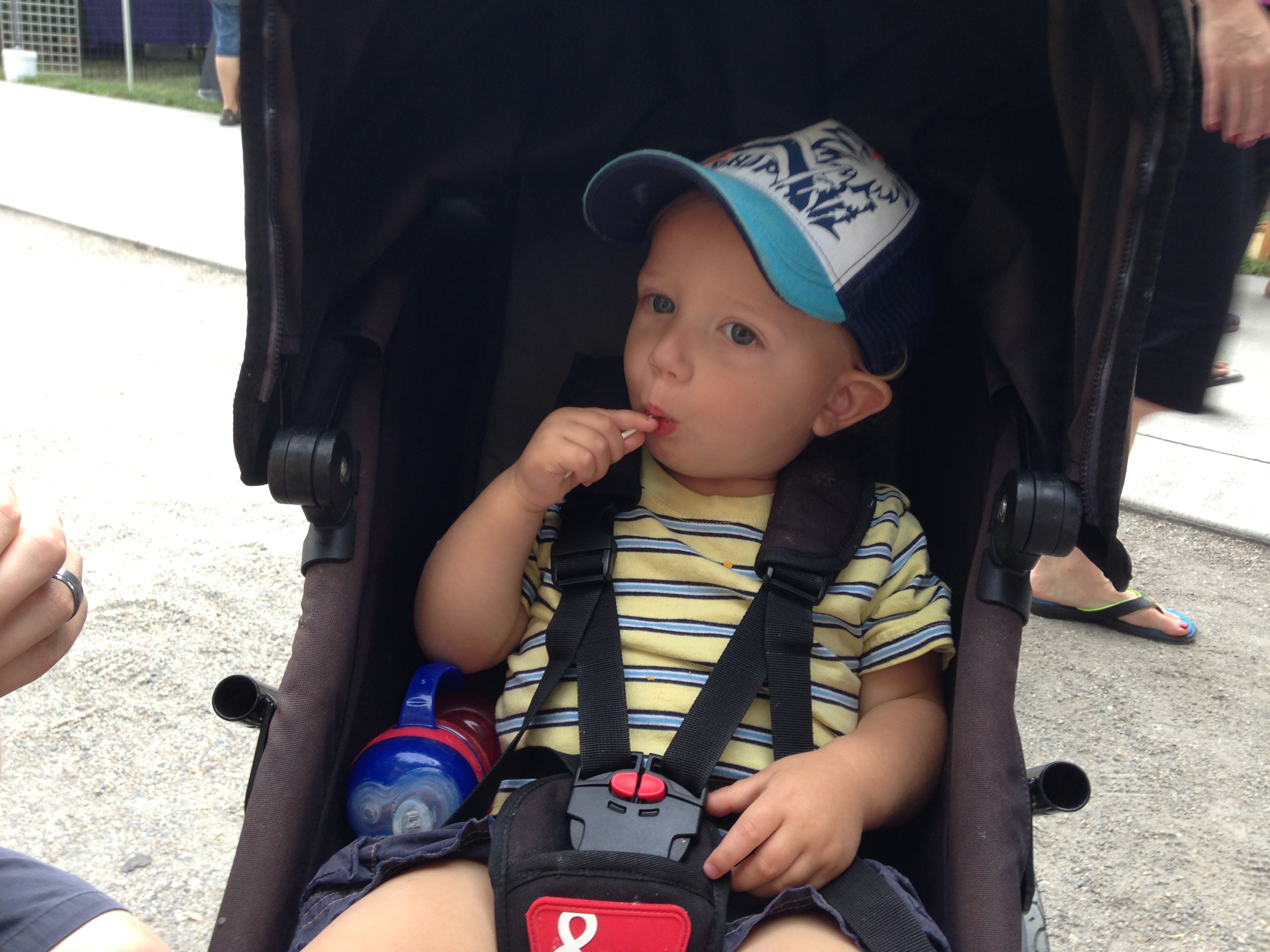 We had a great morning. We played with toys, we tickled and laughed, we sang “Twinkle, Twinkle” dozens of times, and read the first page of ten different books. We went outside, picked up rocks, and tried not to get all wet in the sprinkler. I had a blast. By then it was 7:30 a.m. I could have kept it up for at least another couple of hours, but a trip to the farmer’s market sounded like fun, so we packed up the diaper bag and took off.